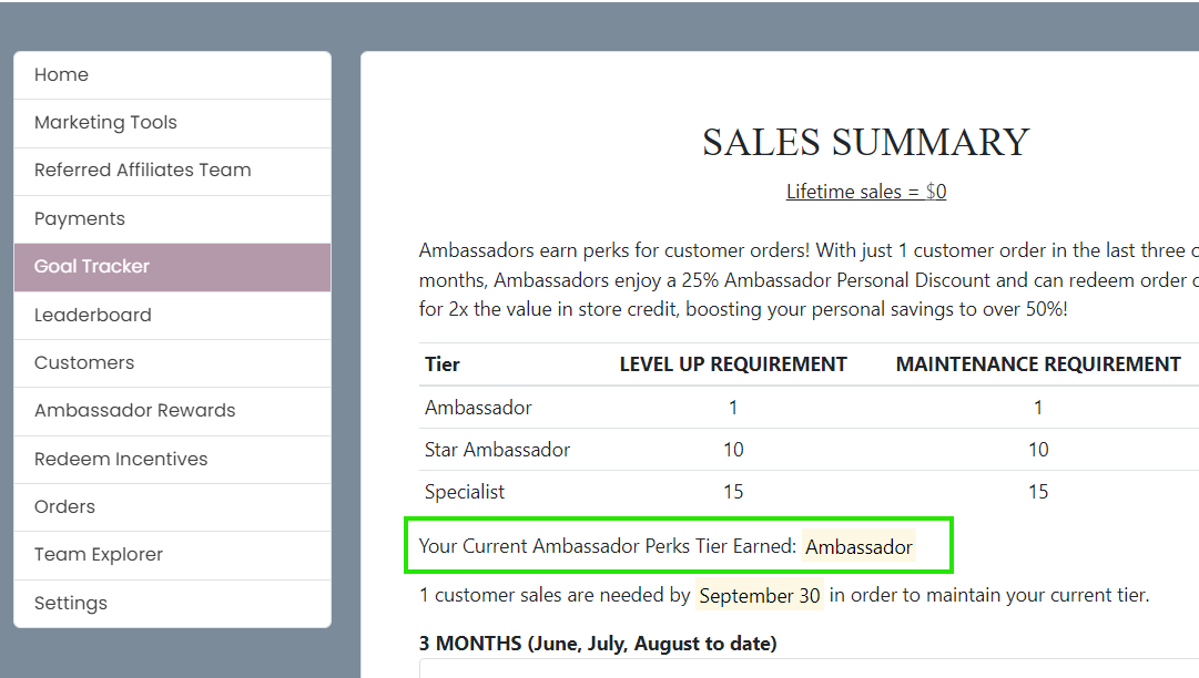 If you're not sure what your tier is, go to your dashboard and the tier is highlighted to the Goal Tracker: