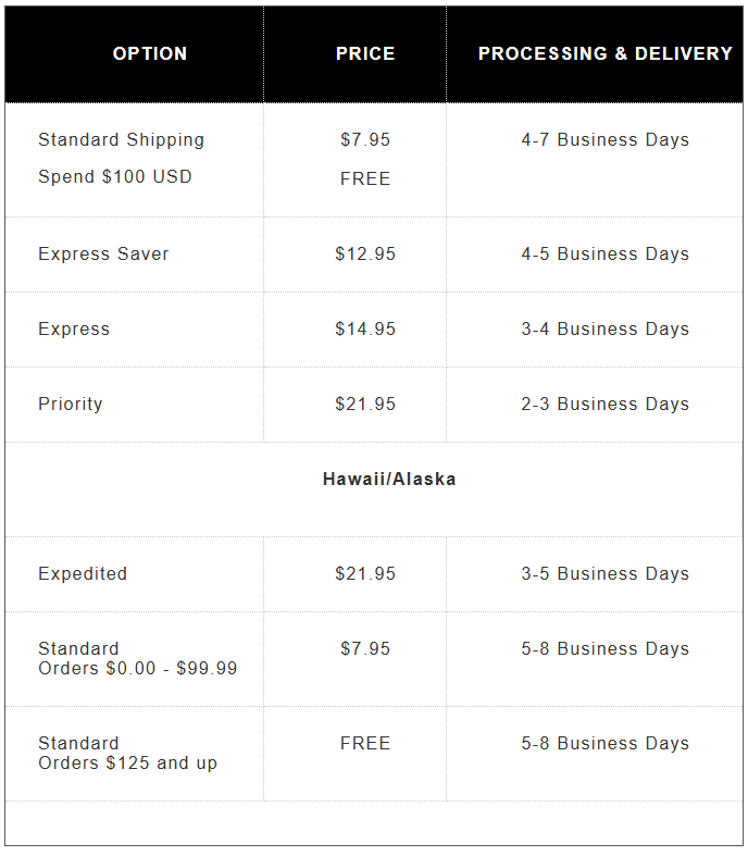 Processing and delivery days fall on business days (Monday - Friday). Standard Federal/Public Holidays are not included in business day calculations. Orders normally ship within 2 business days after placement.